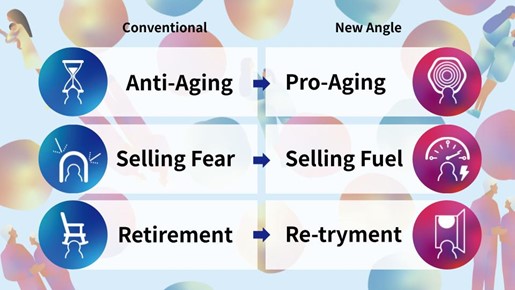 ● New Perspective (Offensive): Viewing aging as a “possibility” and supporting those who continue to update themselves.