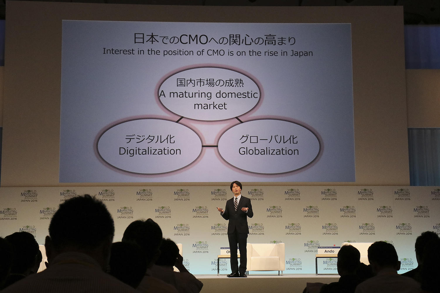 The World Market Summit Japan was held over October 11 – 12, 2016. Hakuhodo planned and held an interactive session titled “The CMO in Japan” at this conference in front of a gathering of global marketing influencers. The session was moderated by Hakuhodo’s General Managere, Motohiro Ando, who welcomed three panelists: Daisuke Otobe, Chief Marketing Officer (CMO) of Shiseido Japan Co., Ltd., Masafumi Ishibashi, CMO of Nestle Japan, and Masahiro Moro, Senior Managing Executive Officer of Mazda Motor Corporation. The panelists discussed the responsibilities and roles of a CMO while mixing in questions from the audience. Observers say marketing is now a core issue for business management. Consequently, the ranks of CMOs, who are the central players in marketing, are expected to increase rapidly in the coming years. We reconvened this valuable session on the potential of and issues facing CMOs.