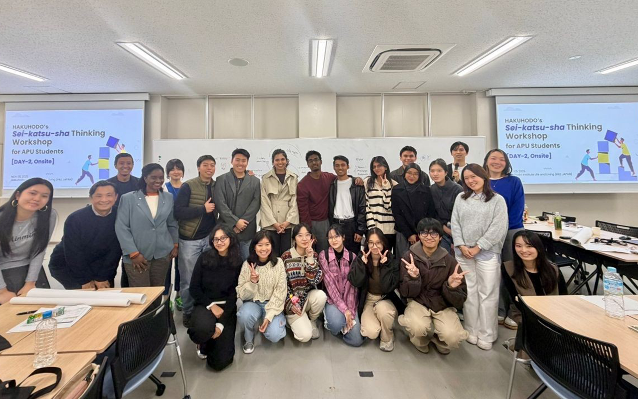 Hakuhodo Institute of Life and Living (HILL), a think tank of Hakuhodo that studies sei-katsu-sha (our term for the holistic person), paired up with Ritsumeikan Asia Pacific University (APU), a center of higher learning with many international students whose mission is to nurture global leaders, to host a hands-on workshop based on Hakuhodo’s Sei-katsu-sha Insight philosophy. The workshop, conducted in English, was held in October (online) and November (face-to-face) 2025.