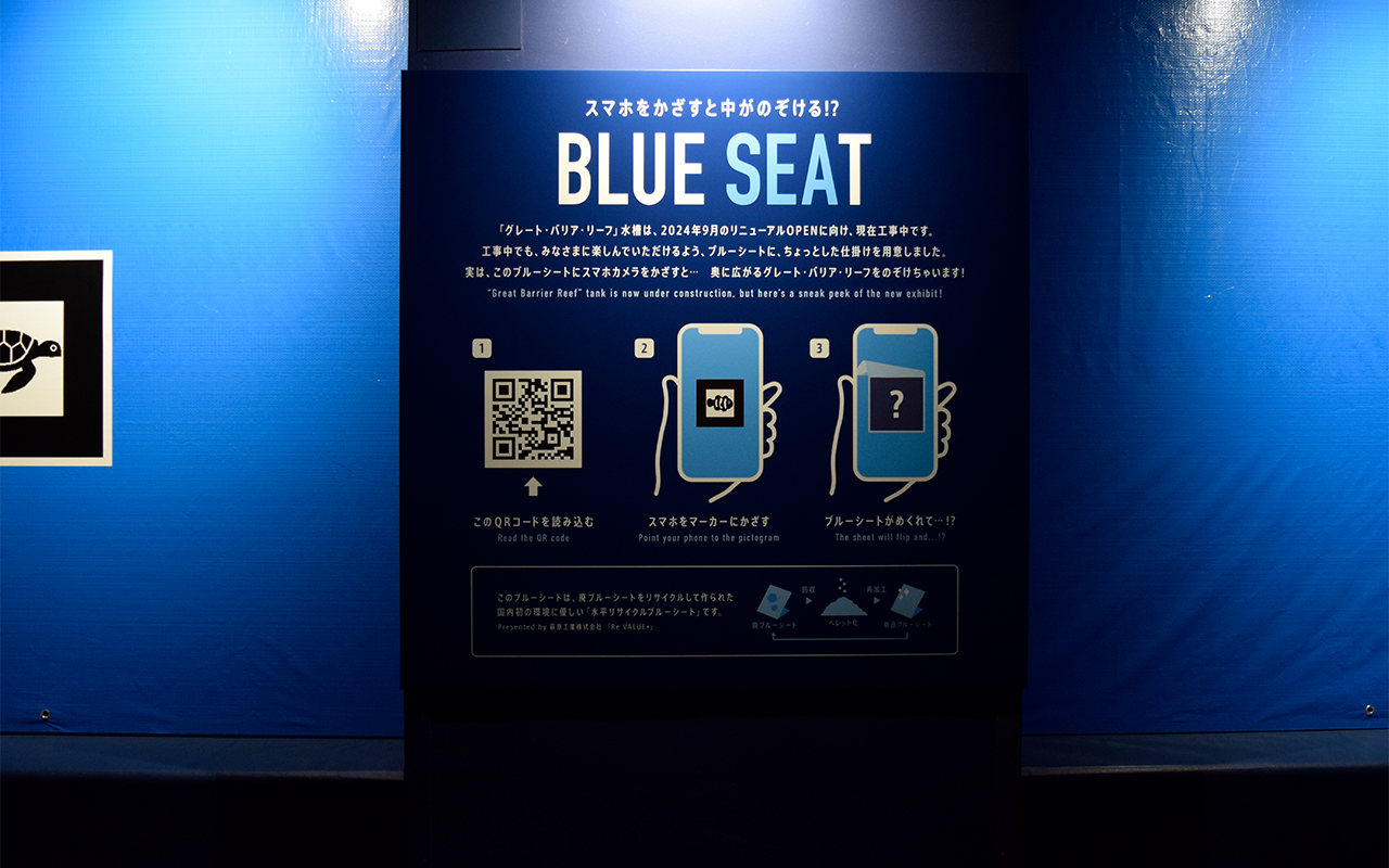 With the cooperation of the aquarium and a manufacturer of construction sheets, two very different businesses, we built a special place that could only be realized during the renovation. Specifically, an AR experience was designed where visitors could point their smartphone camera at symbols on the blue sheet and watch the sheet peel back and reveal what’s inside.